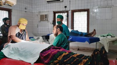 মাগুরায় ২৫০ শয্যা হাসপাতালের অপারেশন থিয়েটারে এপ্রোণ পরে সার্জনের সহযোগী হিসেবে কাজ করছে হাসপাতালের ঝাড়ুদার।