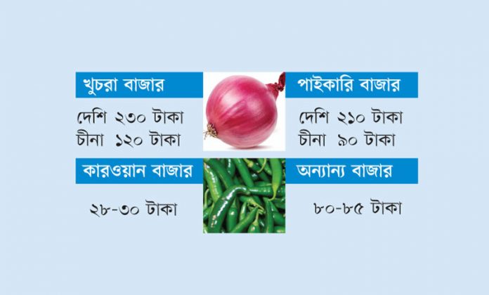 বাজারে পেঁয়াজের দামে স্বস্তি ফেরেনি। চীন থেকে আমদানি করা পেঁয়াজের দাম কমলেও দেশি পেঁয়াজের দাম কমেনি। খুচরা বাজারে প্রতি কেজি দেশি পেঁয়াজ এখনো বিক্রি হচ্ছে ২৩০-২৩৫ টাকায়। আর পাইকারি আড়তে পণ্যটির দাম পড়ছে ২১০-২২০ টাকা। অন্যদিকে মিয়ানমার ও পাকিস্তান থেকে আমদানি করা পেঁয়াজের দাম বাড়েনি, কমেওনি। শুধু চীন থেকে আমদানি করা পেঁয়াজের দাম কমে পাইকারি বাজারে বিক্রি হচ্ছে ৯০-১০০ টাকা। আর খুচরা বাজারে ১২০-১৪০ টাকা। এই পেঁয়াজই দুই দিন আগে পাইকারিতে বিক্রি হয়েছে ১৪০-১৫০ টাকা। আর খুচরায় ১৬০-১৮০ টাকা।