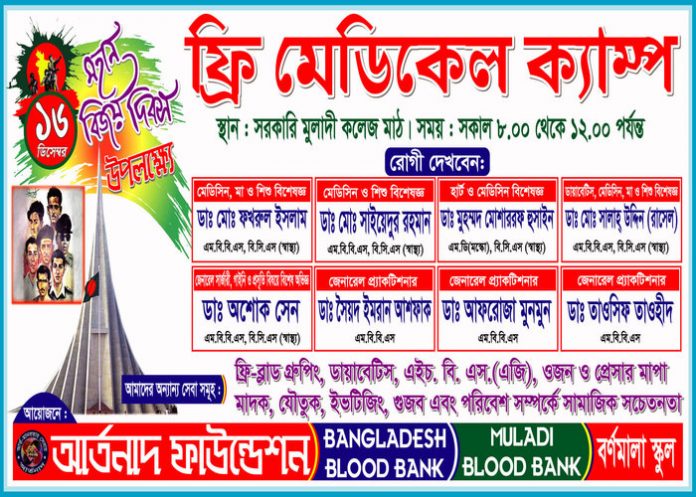 ১৬ ডিসেম্বর, মহান বিজয় দিবস-২০১৯ উদযাপনের লক্ষ্যে আর্তনাদ ফাউন্ডেশন দিনব্যাপী মুলাদি সরকারি কলেজ মাঠে ফ্রি মেডিকেল ক্যাম্প এর আয়োজন করবে। উক্ত ক্যাম্পে ৮-১০ জন বিশেষজ্ঞ ডাক্তার চিকিৎসা সেবা প্রদান করবেন।