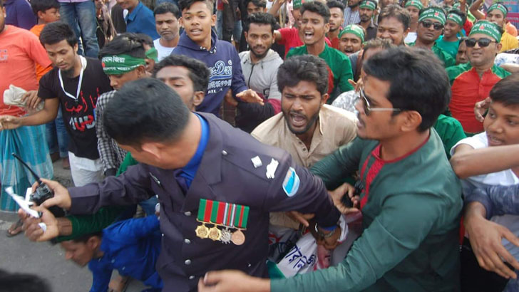 মিছিলটি ২নং রেল গেট এলাকাতে পৌঁছালে পুলিশ বাধা দেয়। তখন সদর মডেল থানার পরিদর্শক জয়নাল আবেদীন তাদের ব্যানার কেড়ে নিলে তার উপর চড়াও হয় মিছিলকারীরা।তারা পরে ধাওয়া করে জয়নাল আবেদীনকে লাঞ্ছিত করে এবং পোশাক ধরে টানাটানি করতে থাকে। এক পর্যায়ে অতিরিক্ত পুলিশ আসলে মিছিলকারীদের উপর লাঠিচার্জ করে ছত্রভঙ্গ করে দেয়।