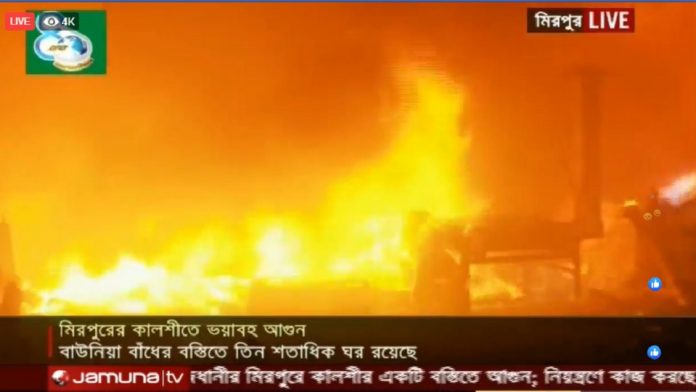 রাজধানীর মিরপুরে কালশীর একটি বস্তিতে ভয়াবহ আগুন লেগেছে। বৃহস্পতিবার দিবাগত রাত ১টার দিকে এ অগ্নিকাণ্ডের সূত্রপাত হয় বলে জানায় প্রত্যক্ষদর্শীরা।