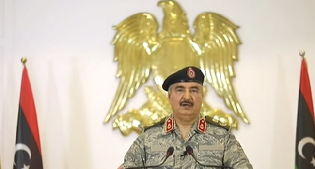 শুক্রবার টেলিভিশনে প্রচার করা এক ভাষণে হাফতার বলেন, ‘আমরা চ্যালেঞ্জ গ্রহণ করেছি এবং আমি যুদ্ধ ঘোষণা করে লিবিয়ার সব নাগরিককে অস্ত্র হাতে তুলে নেয়ার আহ্বান জানাচ্ছি।’