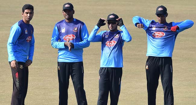 Bangladesh captain Mahmudullah (L) takes part along with teammates in a training session at the Gaddafi Cricket Stadium in Lahore on January 23, 2020, ahead of the T20 cricket match of a three-match series between Pakistan and Bangladesh. (Photo by ARIF ALI / AFP)