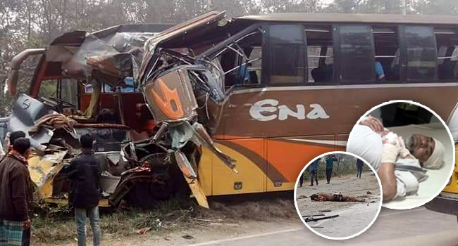 জিএমপি’র সদর থানার ওসি আলমগীর ভুঁইয়া জানান, ঢাকা থেকে এনা পরিবহনের একটি যাত্রীবাহী বাস শনিবার সকালে ময়মনসিংহের দিকে যাচ্ছিল। পথে বেলা ১১টার দিকে বাসটি ঢাকা-ময়মনসিংহ মহাসড়কের গাজীপুরের রাজেন্দ্রপুর চৌরাস্তা এলাকার ভাওয়াল জাতীয় উদ্যানের ৩নং গেইটের সামনে ময়দা-আটা বোঝাই অপর একটি কাভার্ডভ্যানকে ওভারটেক করার চেষ্টা করে। এসময় বাসটির চালক নিয়ন্ত্রণ হারিয়ে ওই কাভার্ডভ্যানের পেছনে সজোরে ধাক্কা দেয়। এতে কাভার্ডভ্যানটি সড়কের পাশে উল্টে যায় এবং বাসের সামনের অংশ দুমড়ে মুছড়ে যায়। এ ঘটনায় বাসের সুপারভাইজার তৈয়বুর রহমান (৪৫) ও হেলপার (২৫) ঘটনাস্থলেই নিহত এবং অন্তত আরো ১৮জন আহত হয়েছে। নিহত তৈয়বুর নরসিংদী জেলা সদরের চরদিঘলদী এলাকার আব্দুল কাদিরের ছেলে। খবর পেয়ে পুলিশ ও স্থানীয়রা হতাহতদের উদ্ধার করে। হতাহতরা সবাই বাসের আরোহী ছিলেন।