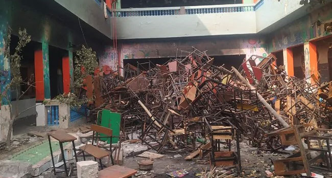 স্কুলের মালিক ফৈজল ফারুখ বলেন, ‘সোমবার স্কুলে হামলা চালানো হয়েছিল। ওরা সব কিছু ভেঙে তছনছ করে আগুন লাগিয়ে দিয়েছিল।’