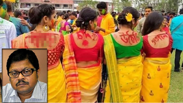 ছবিগুলোতে দেখা গেছে, শাড়ি পরা কিছু নারীর খোলা পিঠে আবির দিয়ে রবীন্দ্রনাথ ঠাকুরের গান বিকৃত করে অশ্লীল শব্দ লেখা রয়েছে। অশ্লীল শব্দ লেখা রয়েছে ছেলেদের বুকেও।