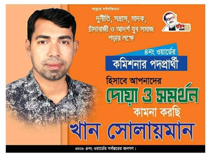 ফোরকান মাহমুদঃ আসন্ন মুলাদী পৌরসভা নির্বাচনে মুলাদী পৌরসভা ৪নং ওয়ার্ড বাসীর খেদমত ও এলাকার মানুষের অনুরোধে কাউন্সিল প্রার্থী হয়েছেন তরুন সমাজ সেবক, সৎ, শিক্ষিত ও সকলের পরিচিত মুখ খান সোলায়মান। তিনি মুলাদী পৌরসভার ৪নং ওয়ার্ডের আলহাজ্ব আঃ জব্বার খানের কনিষ্ট পুত্র। ঢাকা সরকারী তিতুমীর কলেজ থেকে রাষ্ট্রবিজ্ঞান বিষয়ে স্নাকোত্তর পাশ করে এলাকায় সমাজ সেবা ও ব্যবসা বানিজ্যের সাথে যুক্ত আছেন এবং মুলাদী উপজেলা বঙ্গবন্ধু ছাত্র পরিষদের সভাপতি।