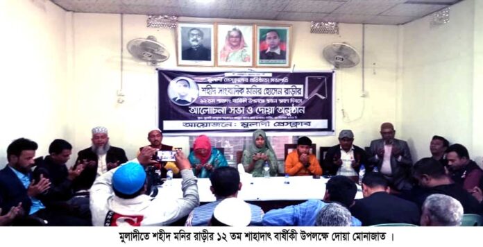 মুলাদী প্রেস ক্লাবের প্রতিষ্ঠাতা সভাপতি শহীদ সাংবাদিক মনির হোসেন রাড়ীর ১২ তম শাহাদাৎ বার্ষিকী উপলক্ষে স্বজন স্মরনে আলোচনা সভা ও দোয়া অনুষ্ঠান ২১ সে ডিসেম্বর বুধবার সকাল ১১টায় শাজাহান মাহমুদ হল রুমে প্রেস ক্লাব সভাপতি আলমগীর হোসেন সুমন রাড়ীর সভাপতিত্বে অনুষ্ঠিত হয়।
