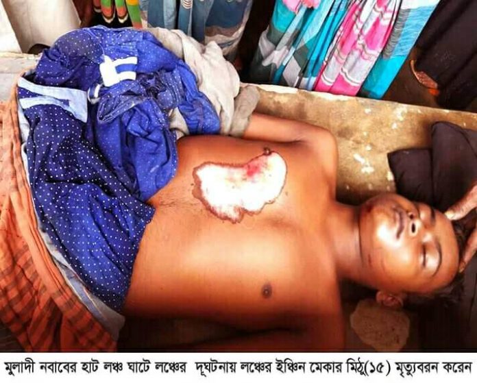 আজ বৃহস্পতিবার বেলা ১১টার দিকে মুলাদী থেকে হোসনাবাদ যাওয়ার পথে আগরপুর-০ ছোট লঞ্চটি নবাবের হাট লঞ্চঘাটে ঘাট দেওয়ার সময় পল্টনের সাথে জোরে ধাক্কা লাগলে লঞ্চটির ইঞ্জিন মেকার মুলাদী উপজেলার দক্ষিন চরডাকাতিয়া গ্রামের জাকির খানের পুত্র মোঃ মিঠু (১৫) আহত হয়। লোকজন আহত অবস্থায় তাকে উদ্ধার করে মুলাদী হাসপাতালে নিয়ে আসলে কতর্ব্যরত ডাক্তার তাকে মৃত্যু ঘোষনা করেন। একজন অপ্রাপ্ত কম বয়স্ক ছেলেকে কেন লঞ্চের ইঞ্চিন মেকার হিসেবে নিয়োগ দেয়া হলো এটা প্রশ্ন জন সাধারনের। এ ঘটনায় লঞ্চ মালিকের সাথে যোগাযোগের চেষ্টা করা হলেও তাকে পাওয়া যায়নি।